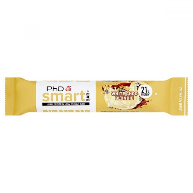 White Chocolate flavour Protein bar with a Caramel layer & Crispy Cocoa Soya pieces, coated in White Chocolate, with Sweeteners.