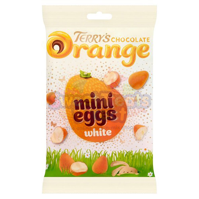 Egg-shaped White Chocolates flavoured with Orange Oil with a crispy coloured Sugar shell.